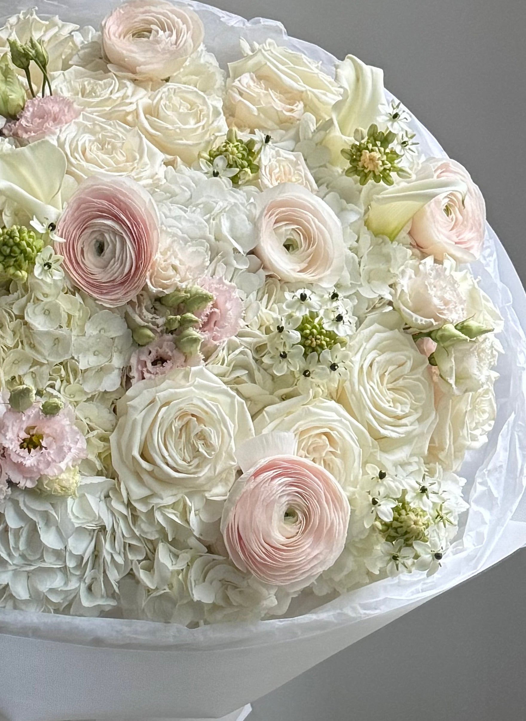 A beautiful mix of white flowers that brings elegance to any room. Like a string of pearls, these pure white blooms create a timeless display.